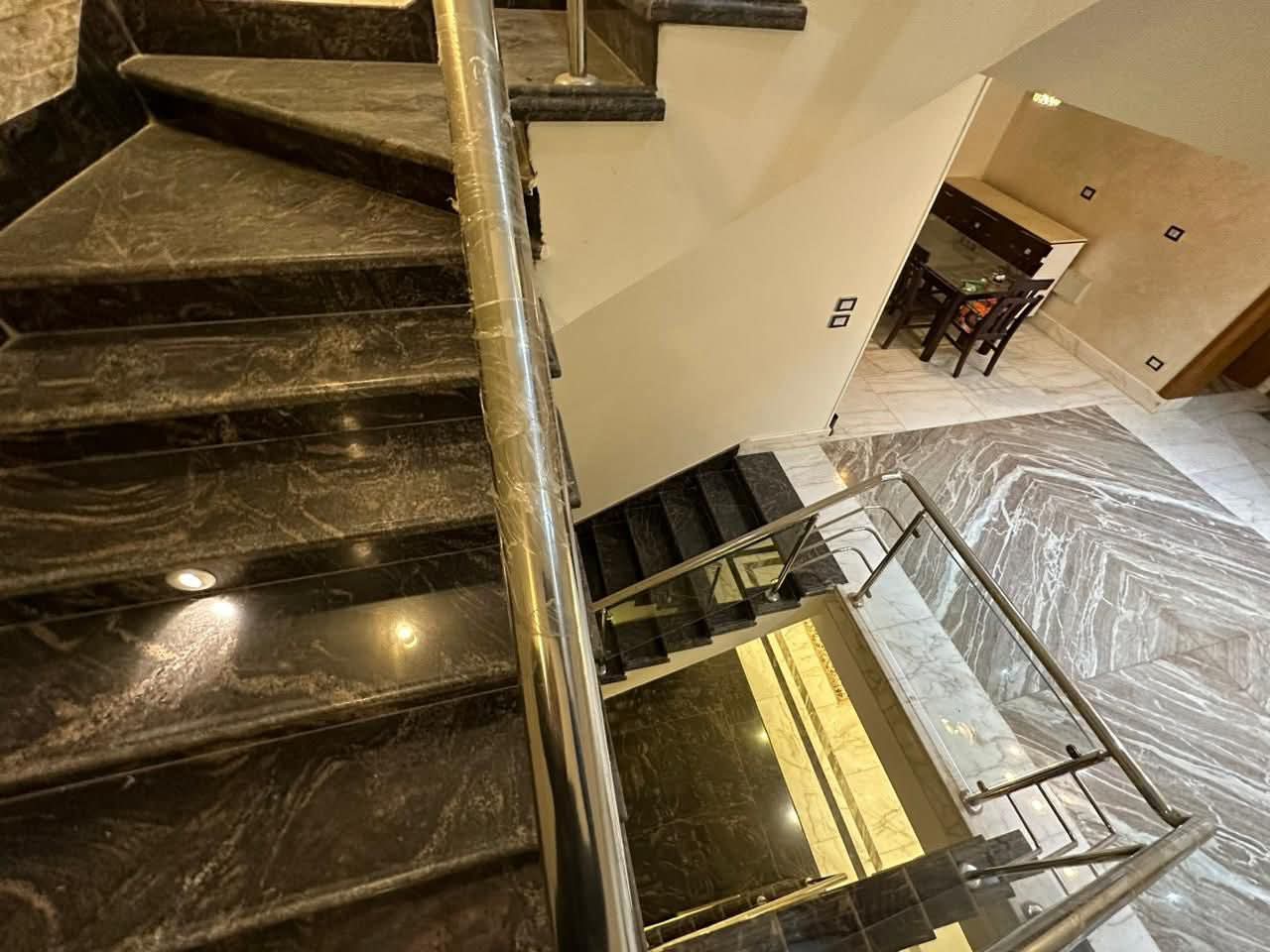 الدور الارضي؛ ريسبشن بمساحه كبيره مقسم صالون قطعتين ومطبخ بخشب طبيعي وحمام