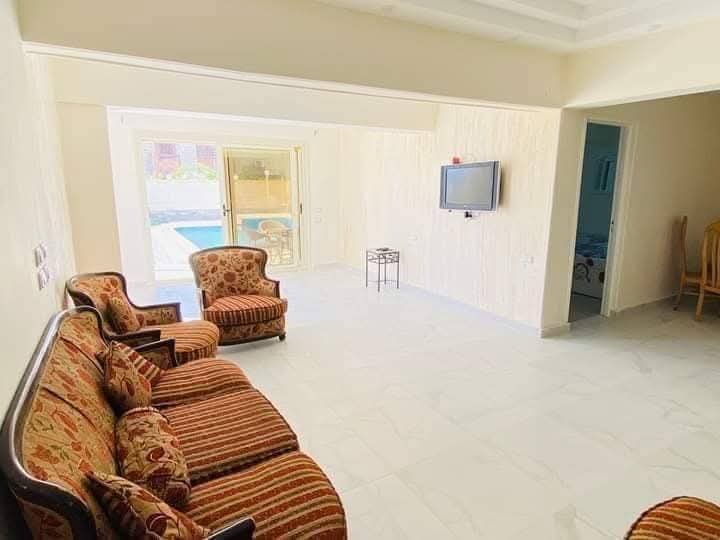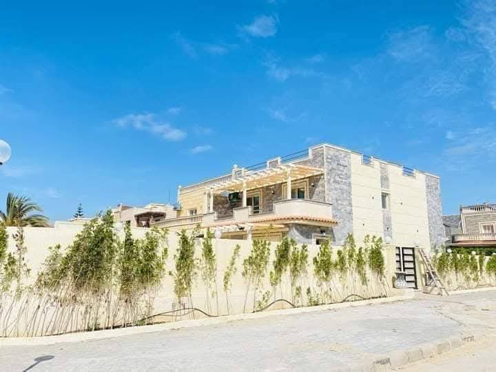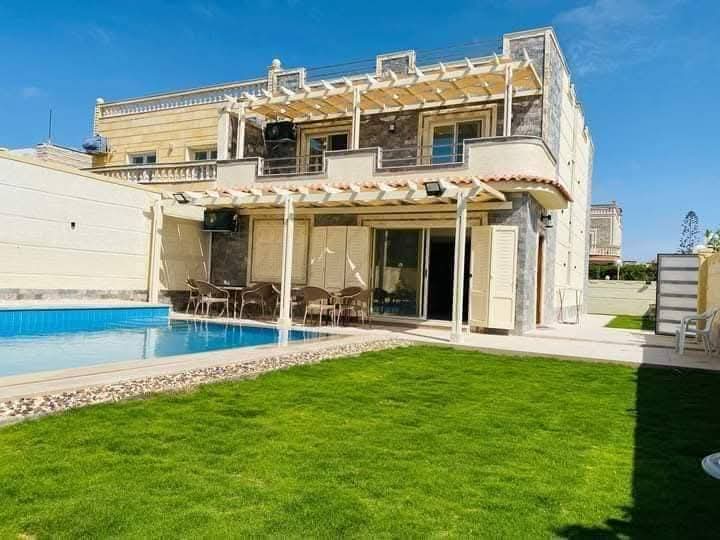 فيلا للايجار في قرية شاطئ الشروق الساحل الشمالي ك41 فيلا خمس غرف نوم من هم اربعه مكيفين واحده مروح ومطبخ وريسبشن واربعه حمام من هم ماستر وحمام سباحة خاص