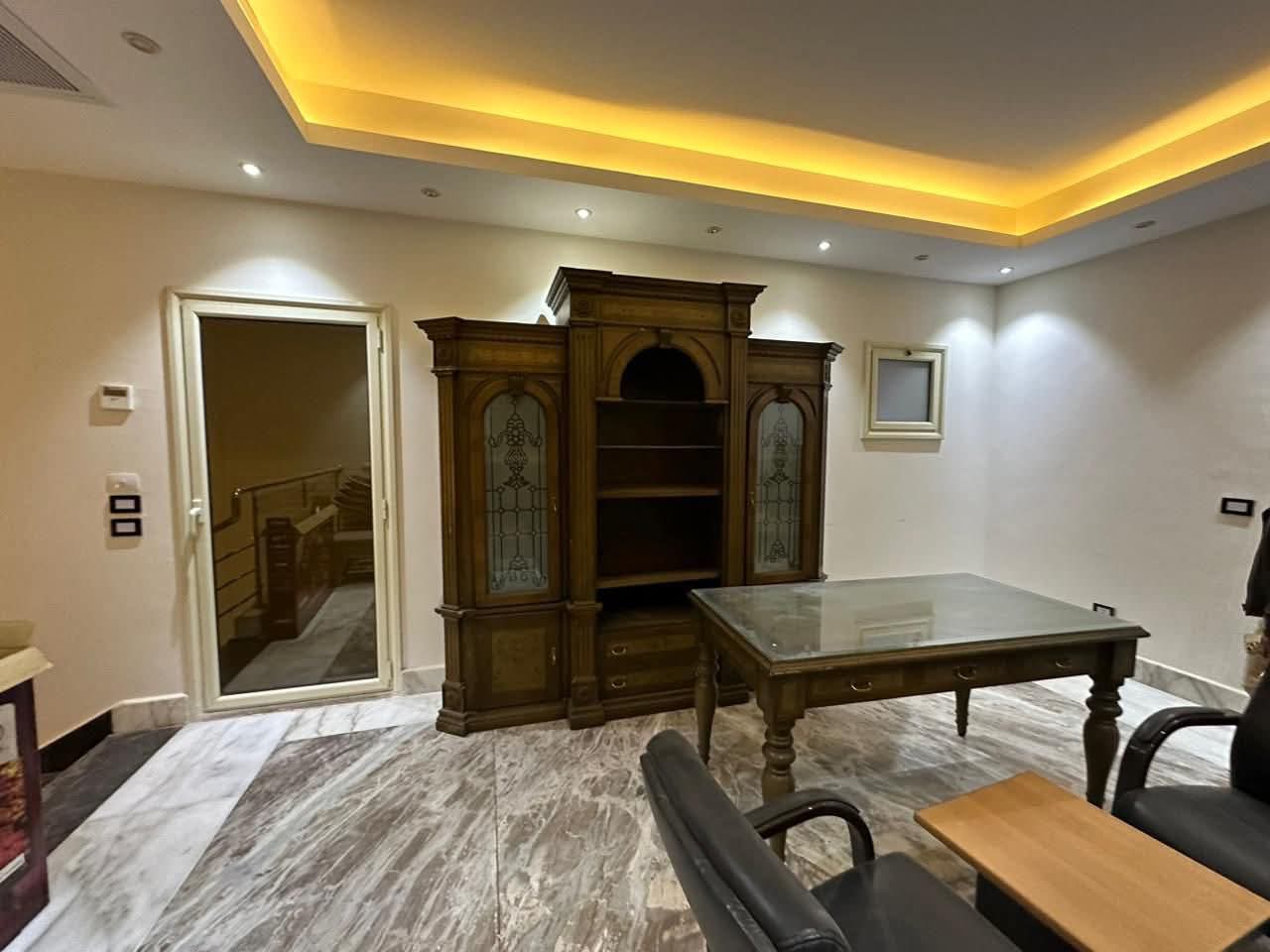 الدور الارضي؛ ريسبشن بمساحه كبيره مقسم صالون قطعتين ومطبخ بخشب طبيعي وحمام
