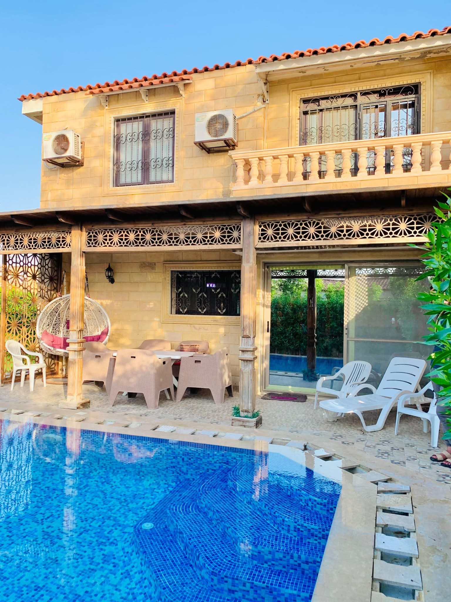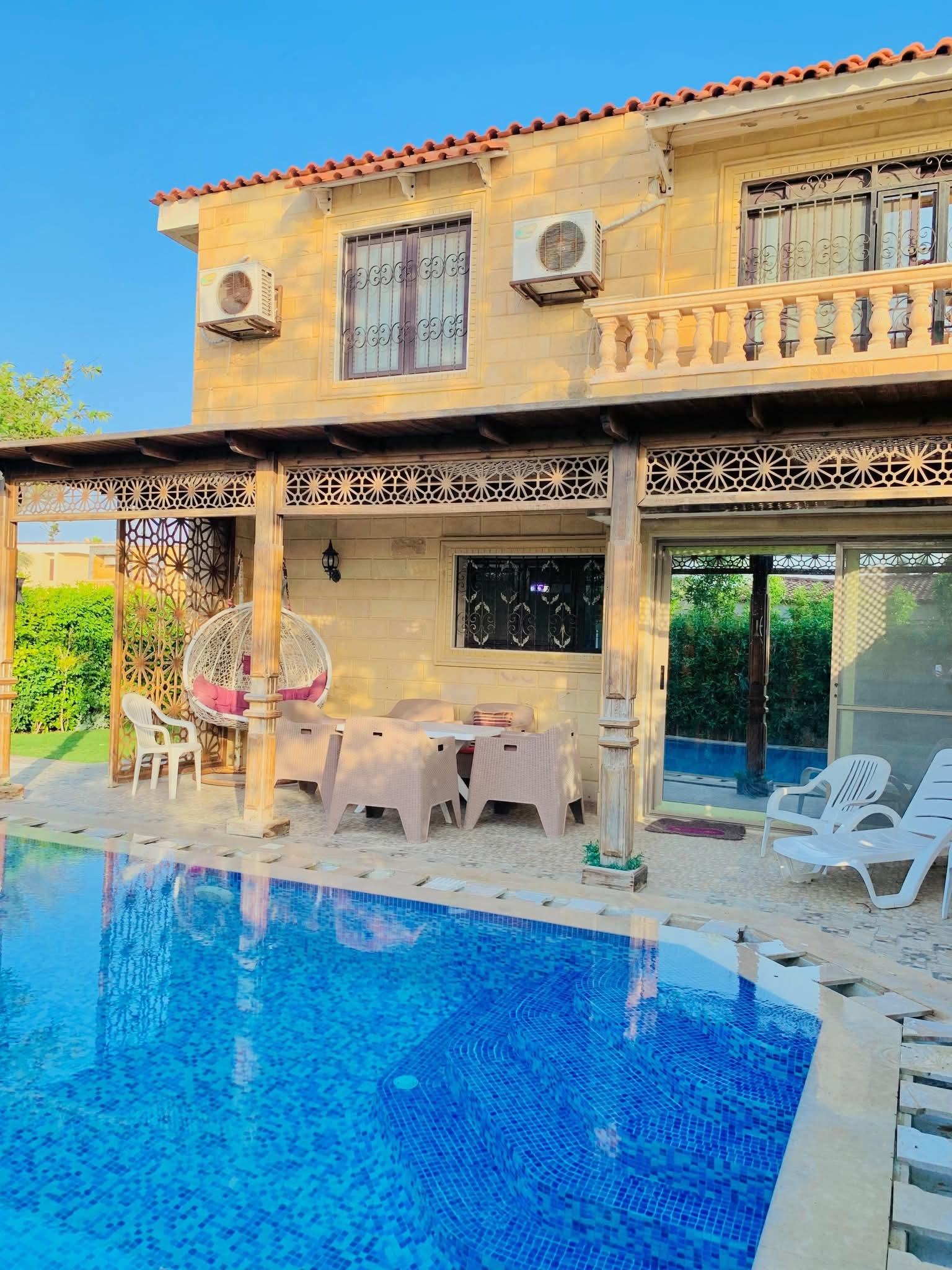 فيلا للايجار متاح من اليوم 4غرف نوم مكيفين 2حمام مطبخ ريسبشن كبير برايفت بول خاص قرية رمسيس ك 45 القرية بها جميع الخدمات