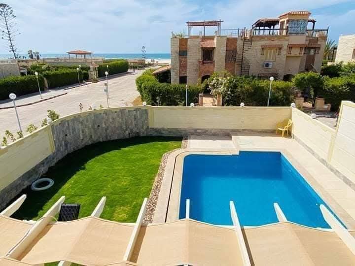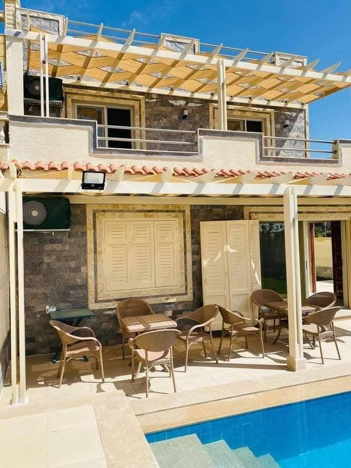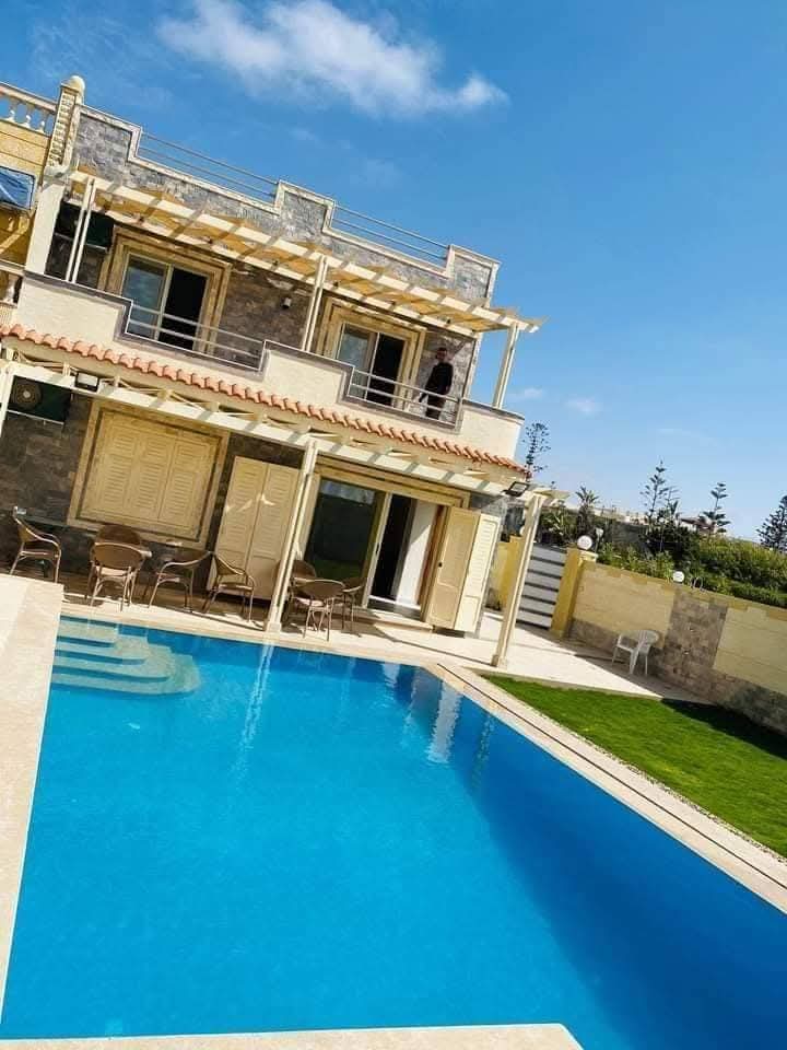 فيلا للايجار في قرية شاطئ الشروق الساحل الشمالي ك41 فيلا خمس غرف نوم من هم اربعه مكيفين واحده مروح ومطبخ وريسبشن واربعه حمام من هم ماستر وحمام سباحة خاص