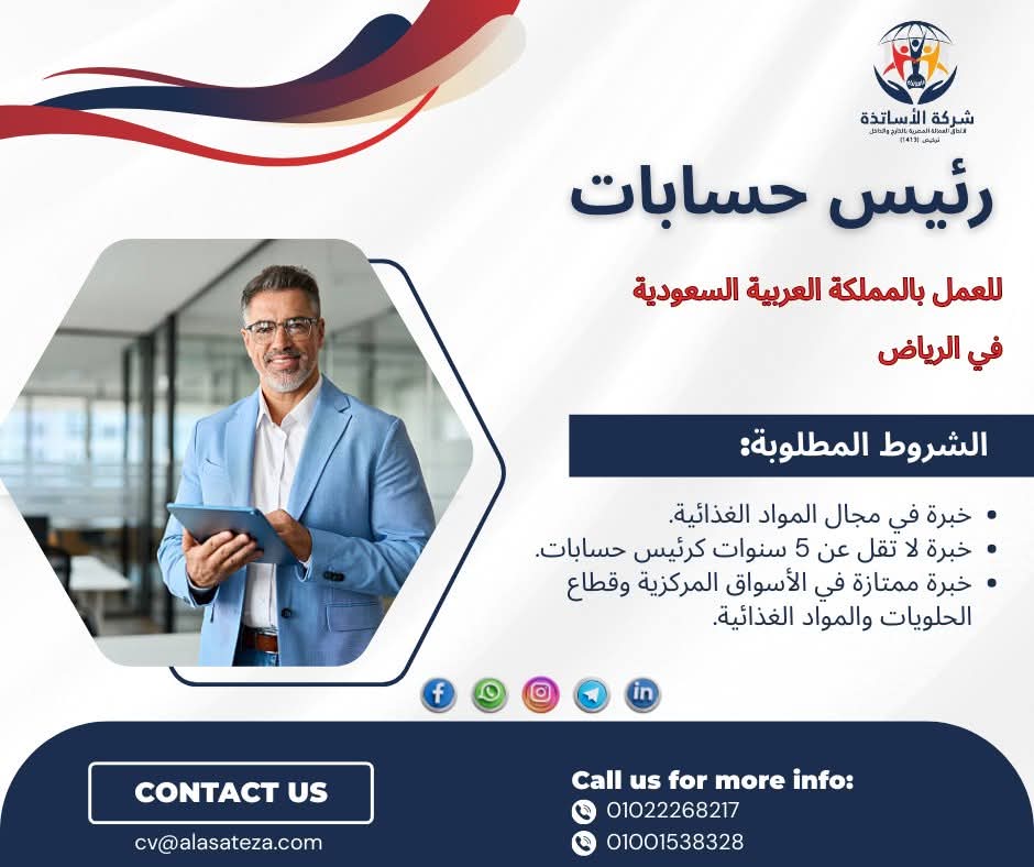 يسرنا أن نعلن عن فتح باب التقديم للوظائف التالية: 1️⃣ محاسب بنوك واستيراد ▪️ شرط أساسي: خبرة لا تقل عن 3 سنوات في نفس المجال. ▪️ إجادة التعامل مع العمليات البنكية ومهام الاستيراد.
