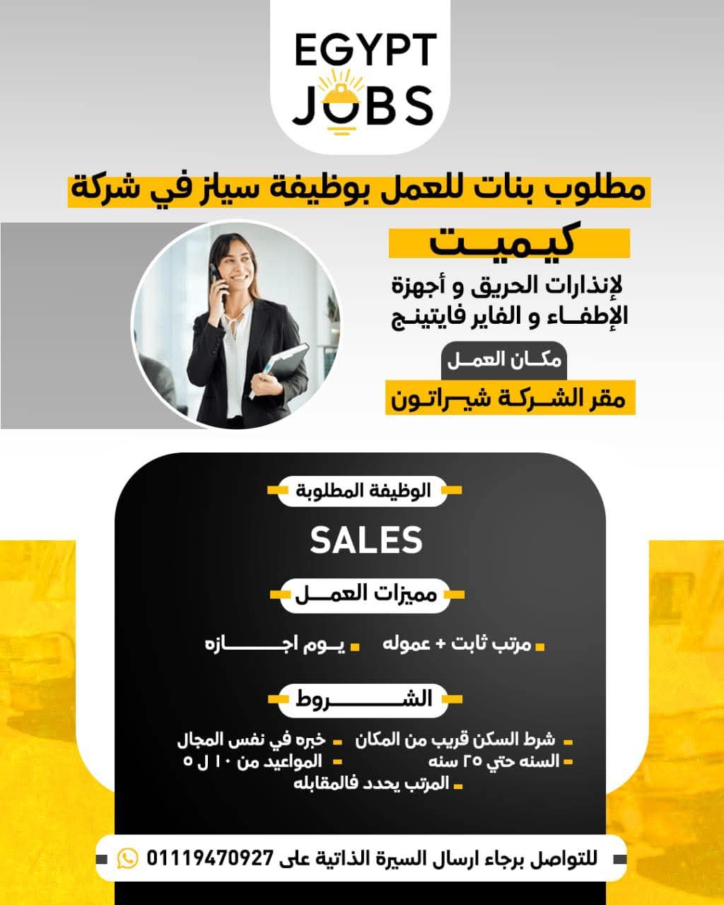 مطلوب بنات سيلز للعمل فوراً في شركه *كيميت لإنذارات الحريق و أجهزه الإطفاء و الفاير فايتينج*✨